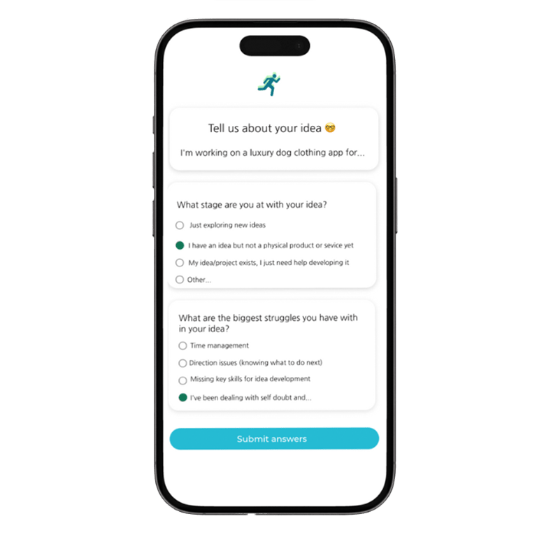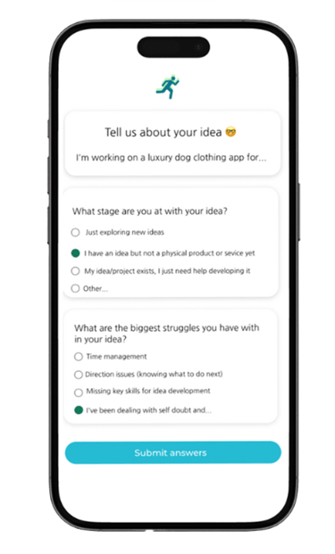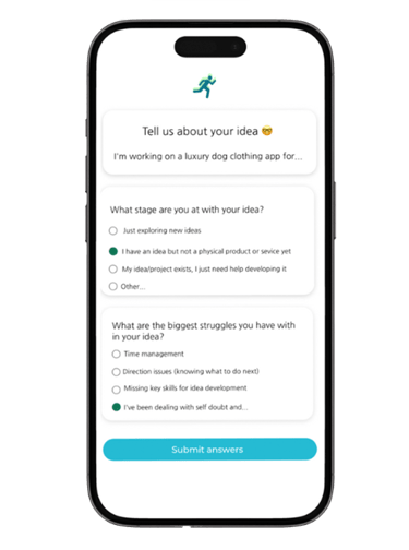 Once you sign up, you'll be asked to answer a few questions based on your idea, key struggles being faced, your strengths & goals you have for your idea.